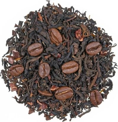 Thee van het Huys, een mooie melange van de smaken uit onze winkel Zwarte thee met koffieboontjes en cacaoschillen, geeft een heerlijke mokka smaak.
